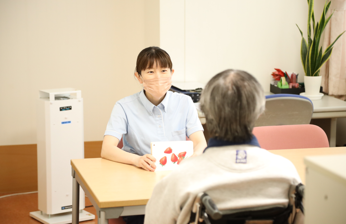 失語症、構音障害、嚥下障害、認知症を含む高次機能障害を中心に、言語室・居室・食堂などその人に合った環境で言語聴覚士(ST)による個別訓練を行っています。また、嚥下障害の方に対しては、現在の状態に適した食物形態の工夫や食事方法をご提案しています。