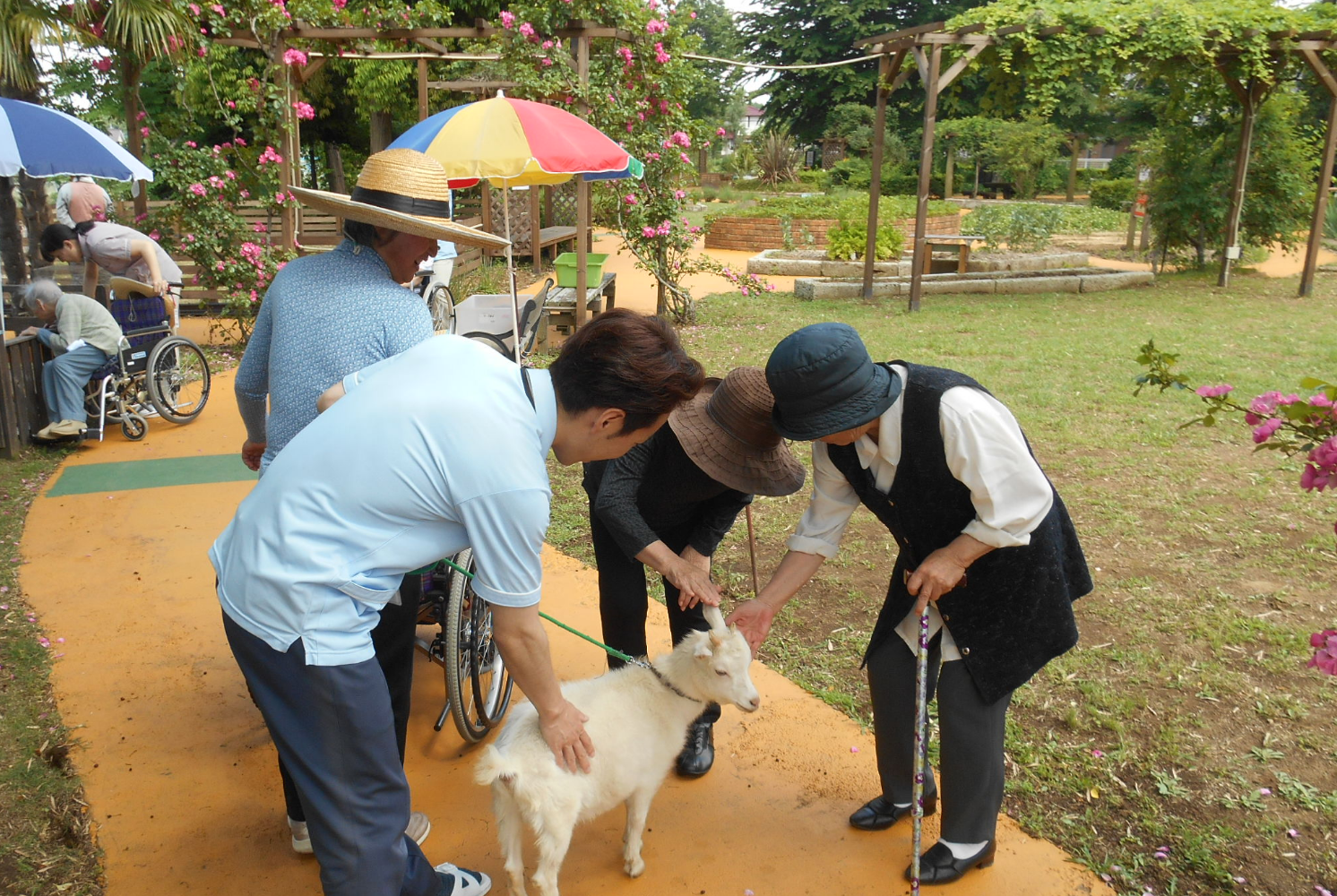 ケアガーデンのアニマルセラピーエリアにて動物との触れ合いが楽しめます。動物との触れ合いによっていやされるだけでなく、感情の安定や意欲の向上などが期待できます。